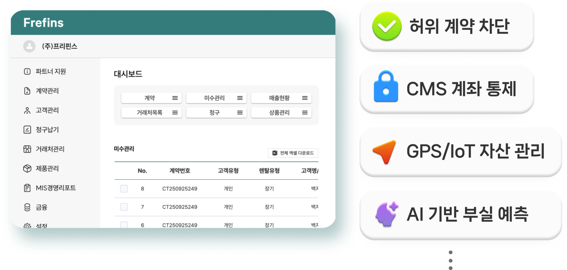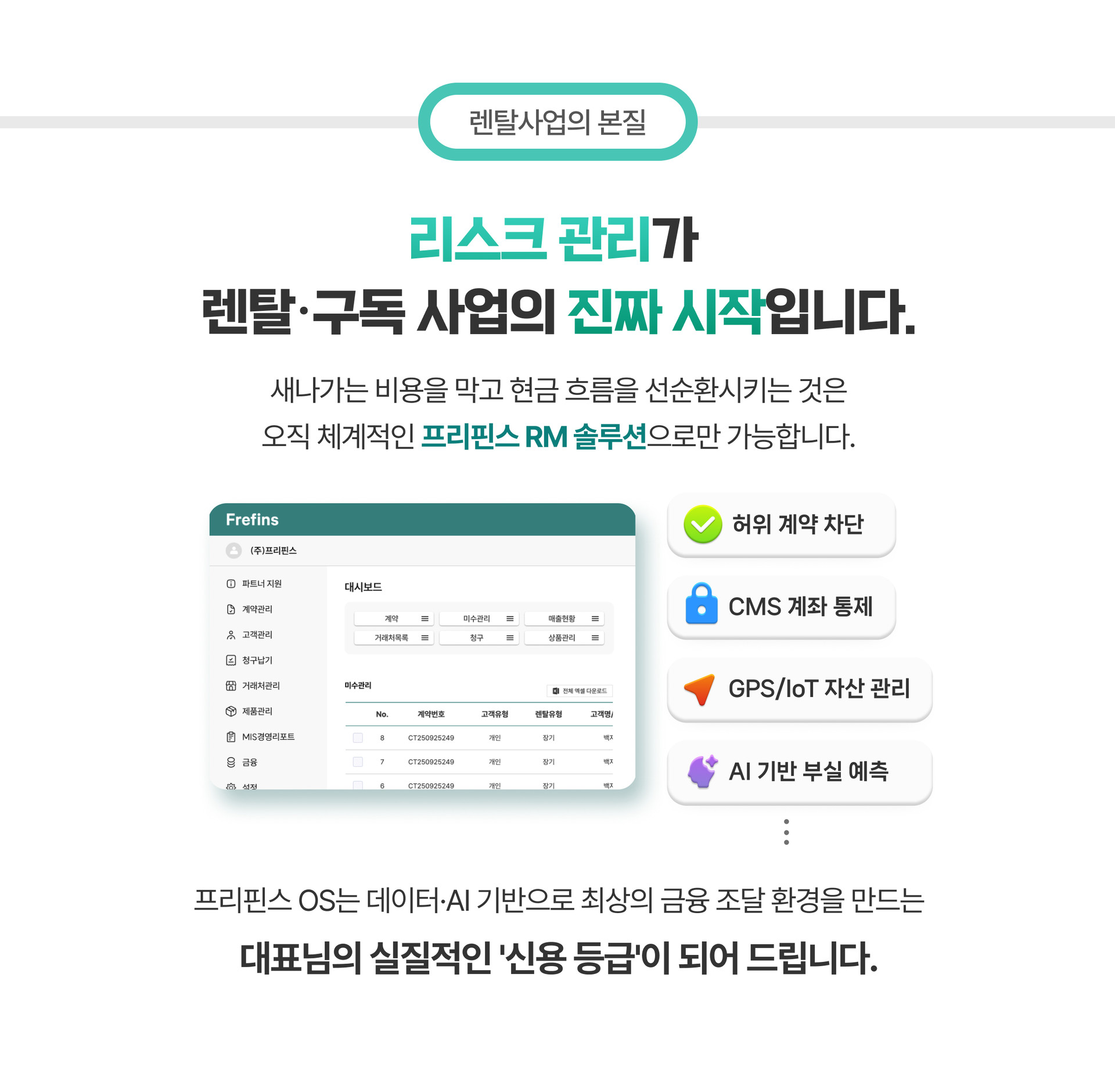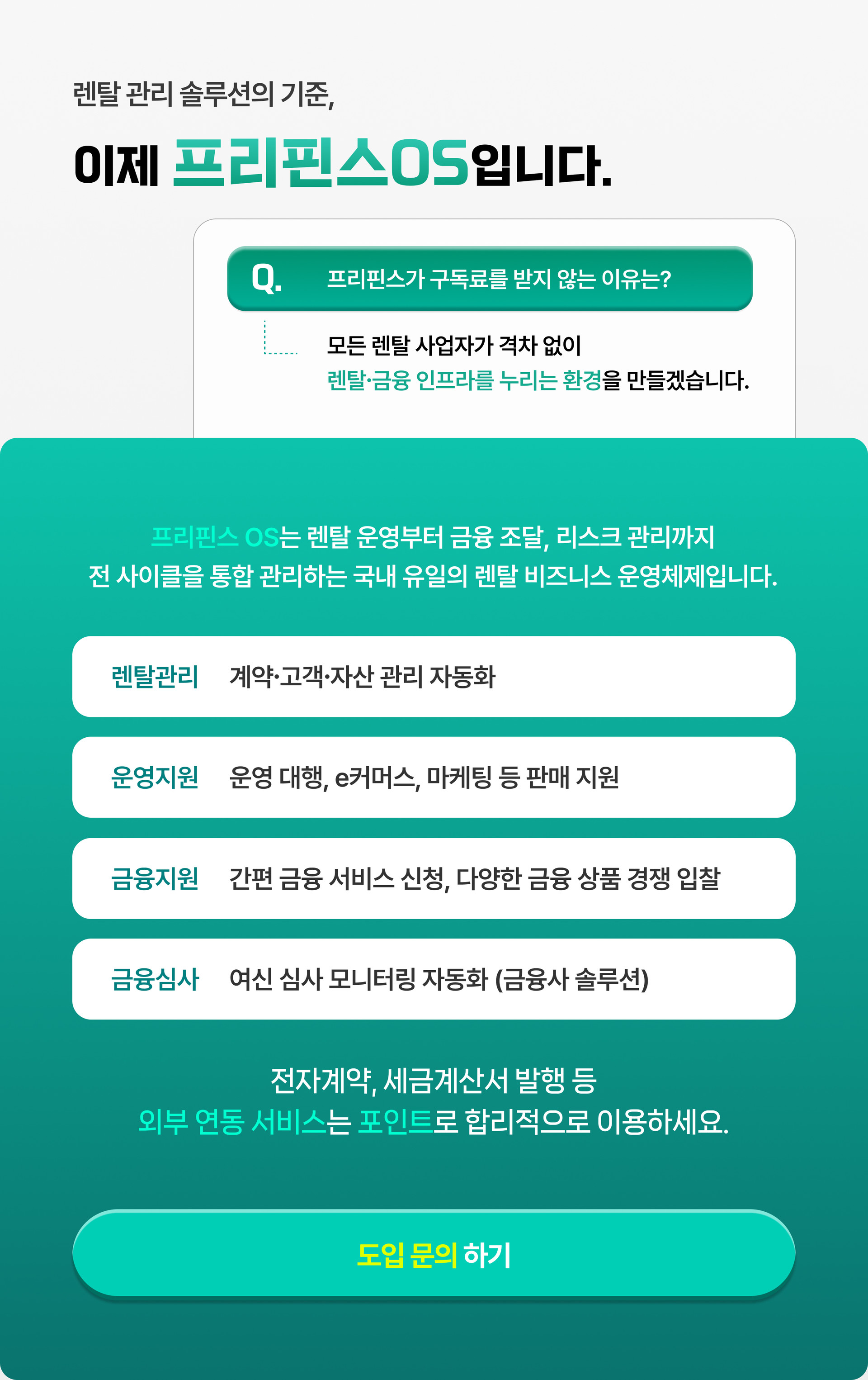 프리핀스 OS는 렌탈 운영부터 금융 조달, 리스크 관리까지전 사이클을 통합 관리하는 국내 유일의 렌탈 비즈니스 운영체제입니다.