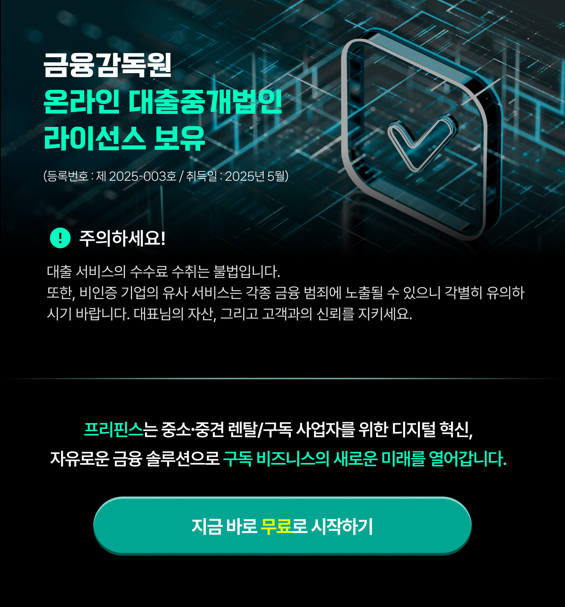 프리핀스는 중소∙중견 렌탈/구독 사업자를 위한 디지털 혁신,자유로운 금융 솔루션으로 구독 비즈니스의 새로운 미래를 열어갑니다.